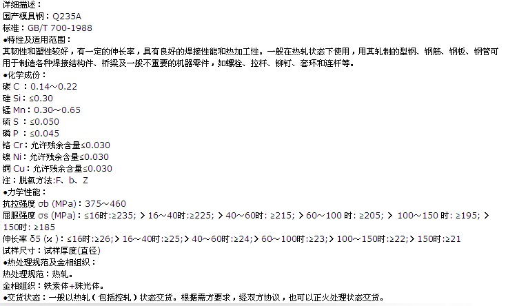 蘇州浩凱Q235A模具鋼物流配送運輸?shù)貐^(qū):北京,上海,重慶,天津,江蘇南京_徐州_蘇州_無錫_昆山_揚州,太倉_吳江_連云港_泰州_鹽城_鎮(zhèn)江_南通_常熟_常州_張家港,浙江溫州,杭州,寧波寧海_余姚_臺州黃巖_金華_紹興_嘉興,福建福州_廈門,廣西南寧_柳州,安徽合肥_安慶_蚌埠_巢湖_淮安_蕪湖_淮南_黃山_滁州_宣城,山東濟南_青島_日照_濱州_煙臺_威海_濟寧_聊城_臨沂_淄博,湖南長沙,重慶,河北石家莊,河南鄭州_洛陽_開封,湖北武漢,江西南昌,陜西西安,山西太原及云南昆明。歡迎各地模具廠商來電垂詢Q235A模具鋼價格和Q235A模具鋼熱處理機加工事宜。目前我司Q235A模具鋼現(xiàn)貨庫存表統(tǒng)計數(shù)量為09噸。