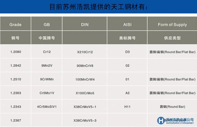 天工模具鋼性能用途、密度硬度和化學成分: 蘇州浩凱金屬材料有限公司大量銷售天工模具鋼,提供天工模具鋼價格新報價,關于天工模具鋼的技術參數及天工模具鋼性能_天工模具鋼密度_天工模具鋼材料材質_天工模具鋼規格型號_天工模具鋼熱處理技巧等可以在線咨詢我們官網的在線客服。天工模具鋼的化學組成元素與含量,亦可以咨詢我們。想了解更多天工模具鋼用途的朋友可以在線咨詢我們的客服,我們竭誠為你提